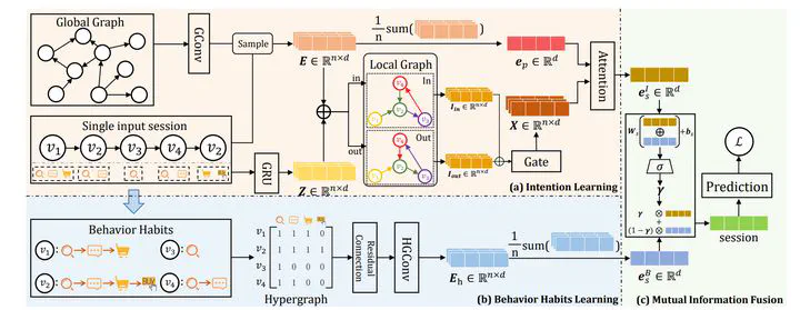 Multi-behavior Session Based Recommendations (MBSBRs) have achieved remarkable results due to considering behavioral heterogeneity in sessions. Yet most existing works only consider binary or continuous behavior dependencies and aim to predict the next item under the target behavior, neglecting users’ inherent behavior habits, resulting in learning inaccurate intentions. To tackle the above issues, we propose a novel Behavior Habits Enhanced Intention Learning framework for Session Based Recommendation (BHSBR) framework. Specifically, we focus on the next item recommendation and design a global item transition graph to learn the behavior-aware semantic relationships between items, in order to mine the underlying similarity between items beyond the session. In addition, we construct a hypergraph to extract the diverse behavior habits of users and break through the limitations of temporal relationships in the session. Compared to the existing works, our behavior habit learning method learns behavior dependencies at the user level, which could capture the user’s more accurate long-term intentions and reduce the impact of noise behaviors. Extensive experiments on three datasets demonstrate that the performance of our proposed BHSBR is superior to SOTA. Further ablation experiments fully illustrate the effectiveness of our various modules.